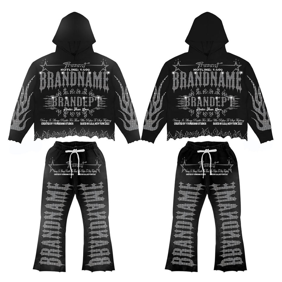 Sudaderas con capucha y pantalones de chándal acampanados de dos piezas para hombre con diamantes de imitación y lavado ácido con logotipo personalizado de talla grande para hombre