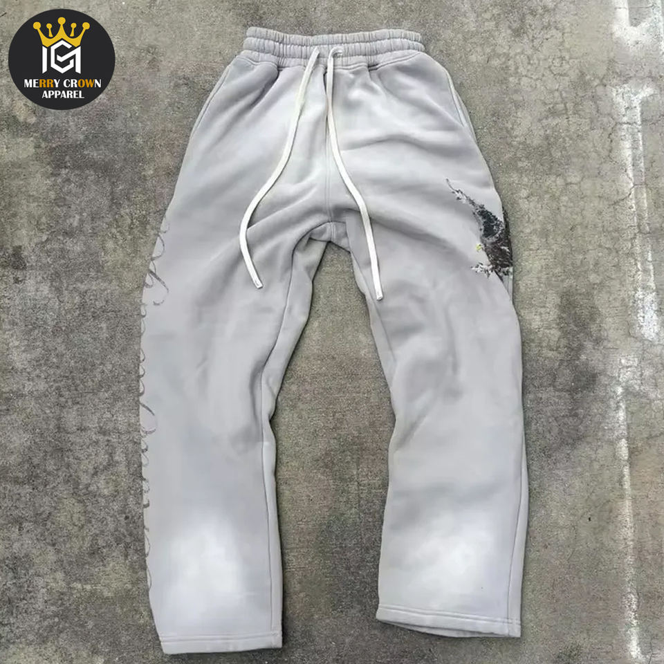 Sudadera con capucha y pantalones de chándal lavados con ácido con logotipo personalizado, chándal desgastado con diamantes de imitación de algodón con estampado de rizo francés DTG