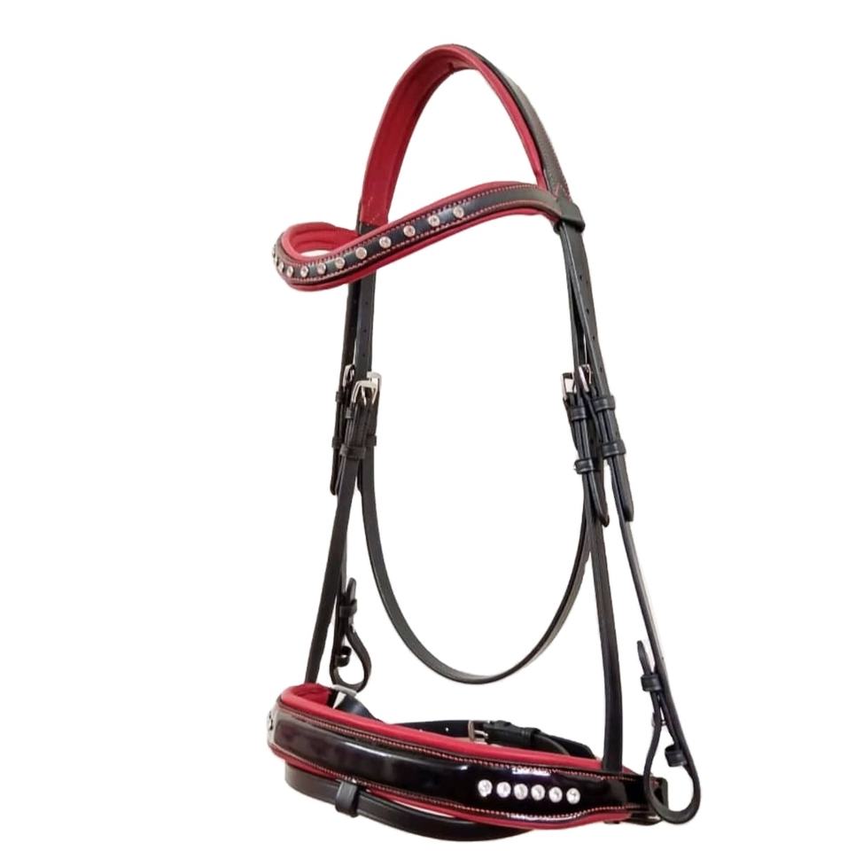 Brida de cuero anatómica con logotipo personalizado para carreras de caballos y equipo ecuestre de PVC con costuras elegantes Bling en Noseband