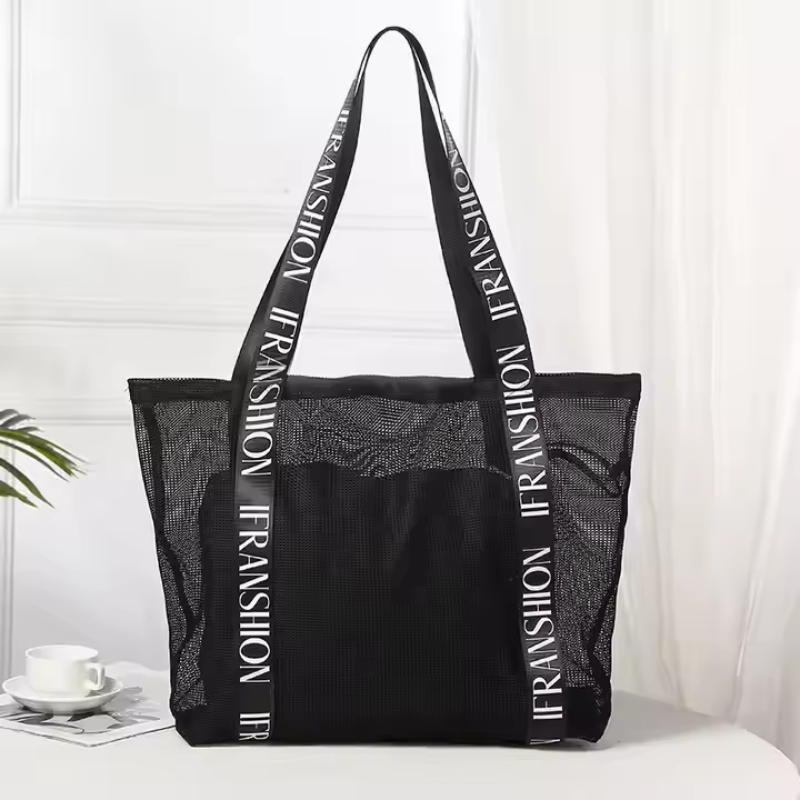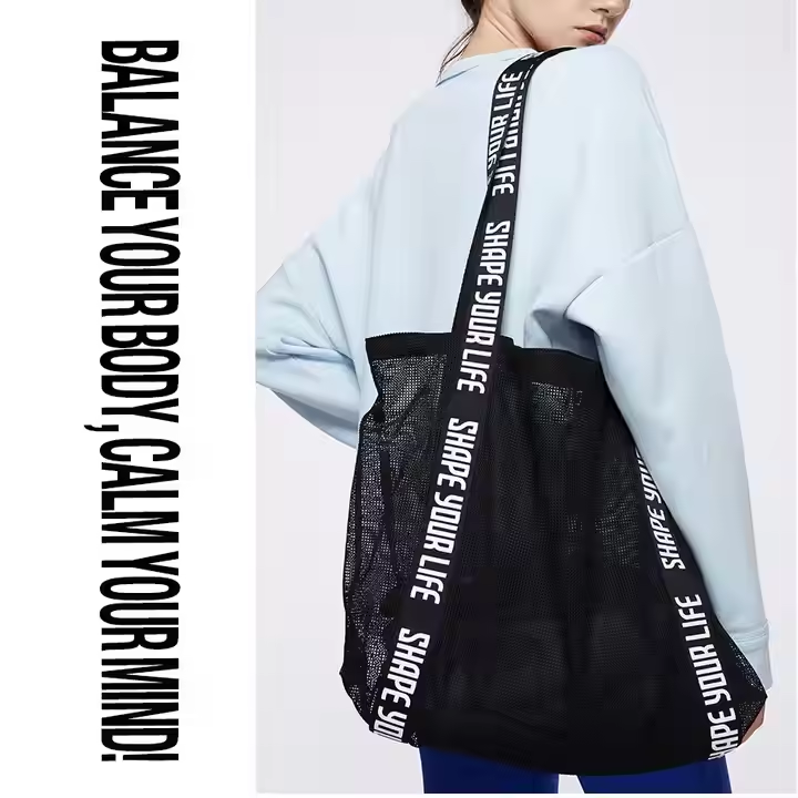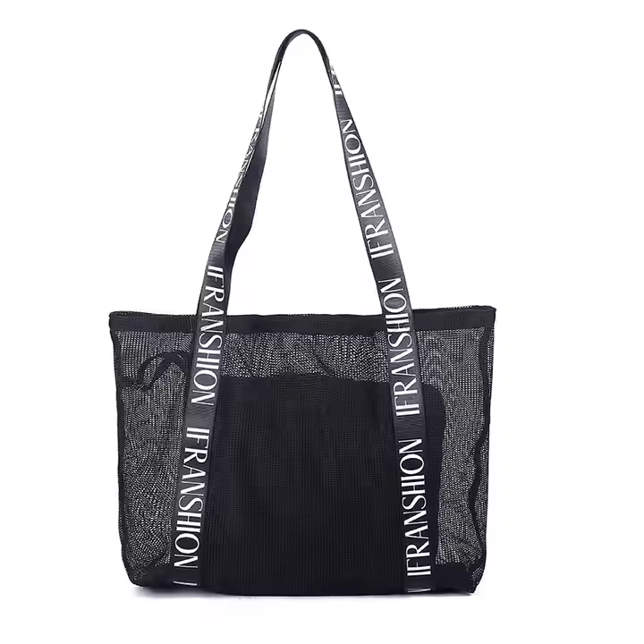 Bolsa de compras de malla de hombro con logotipo personalizado Black Net Sporty con asa de letra fuerte