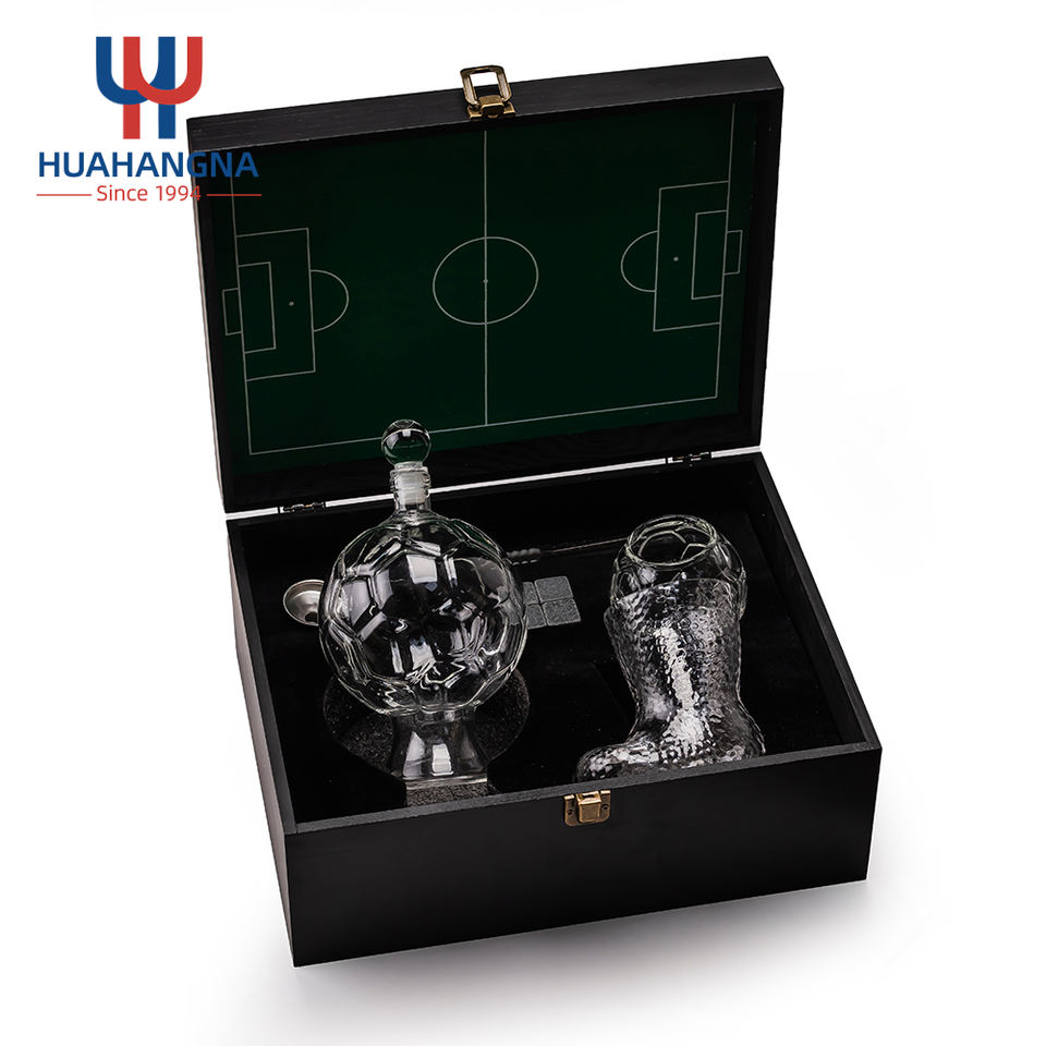 Vaso de Cerveza con Forma de Bota y Decantador de Whisky con Logotipo Personalizado en Caja de Madera Premium para Zona de Aficionados al Fútbol
