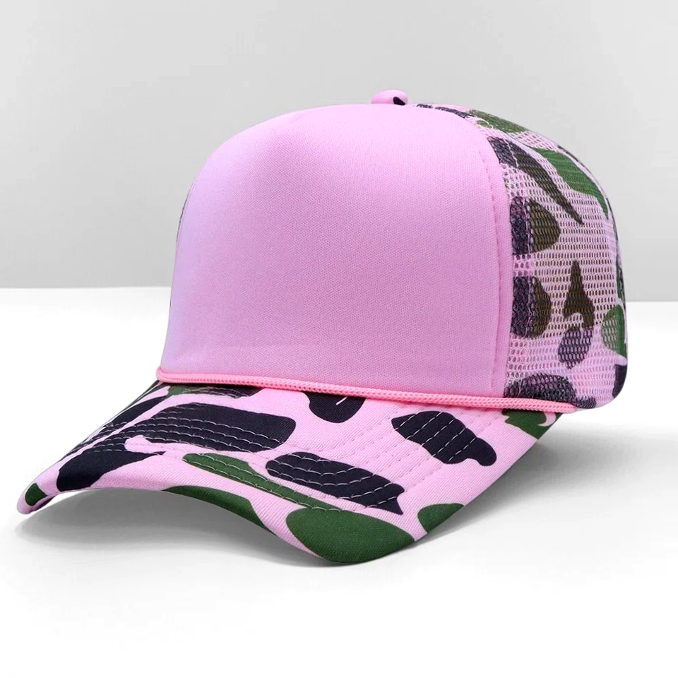 Gorras de camionero personalizadas con logo, estampado de camuflaje, sublimación, espalda de malla a cuadros, espuma, estampado de leopardo, gorras de béisbol de 5 paneles con cuerda
