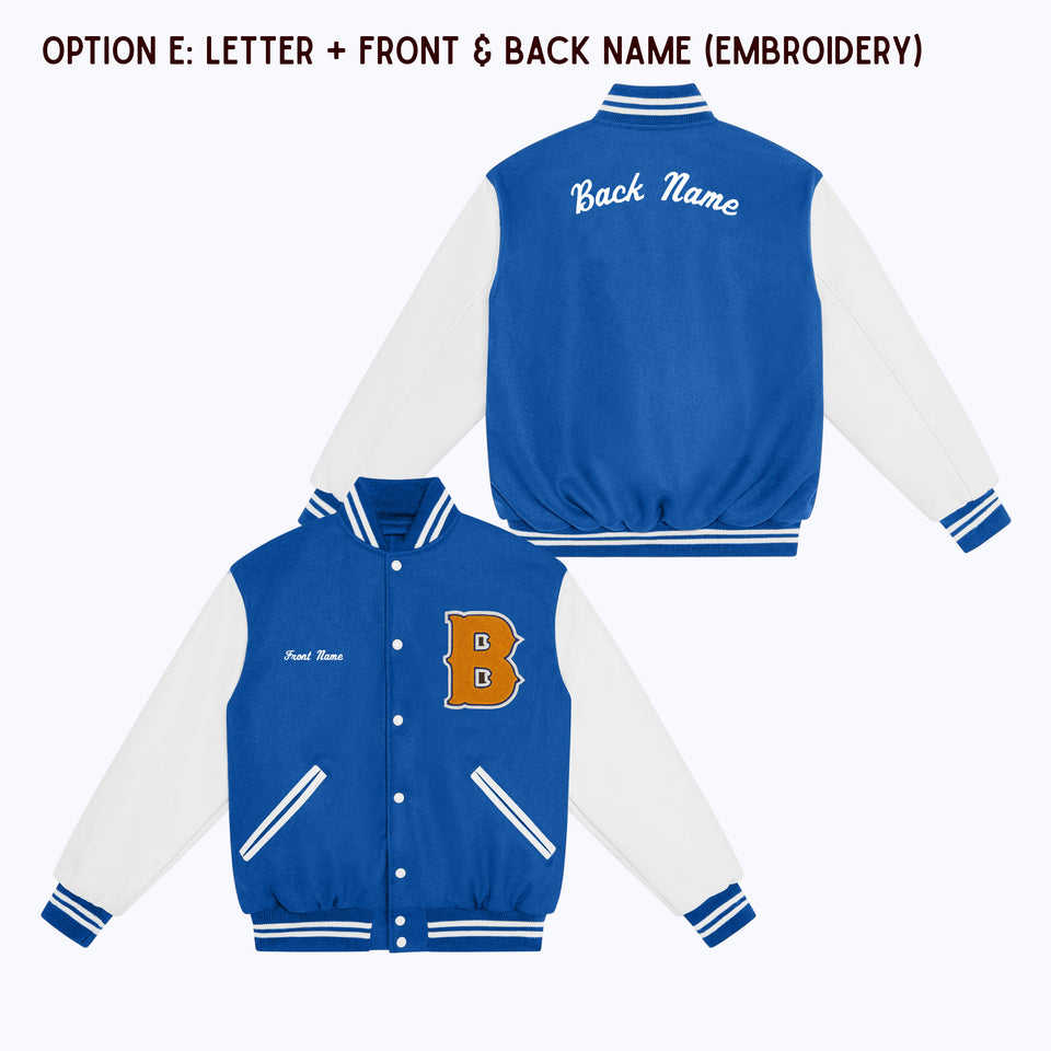 Chaqueta clásica de béisbol para hombre con logotipo personalizado y bordado en la espalda, chaqueta universitaria con mangas blancas y Letras en azul marino