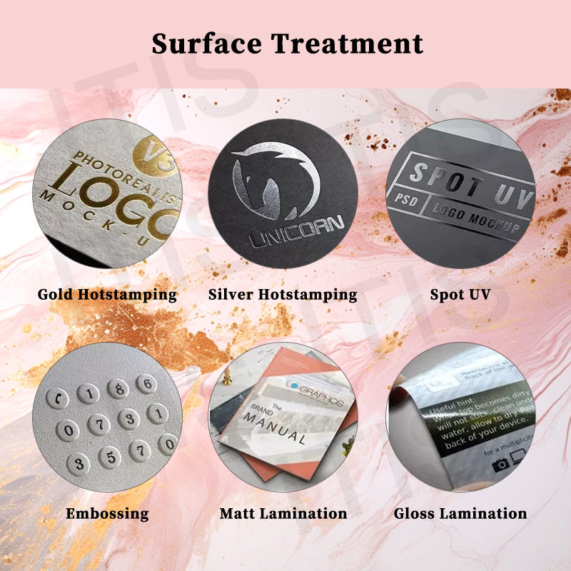 Relieve, Laminación brillante, Laminación mate, Estampado, Revestimiento UV, Barnizado, Desaparición, Lámina de oro