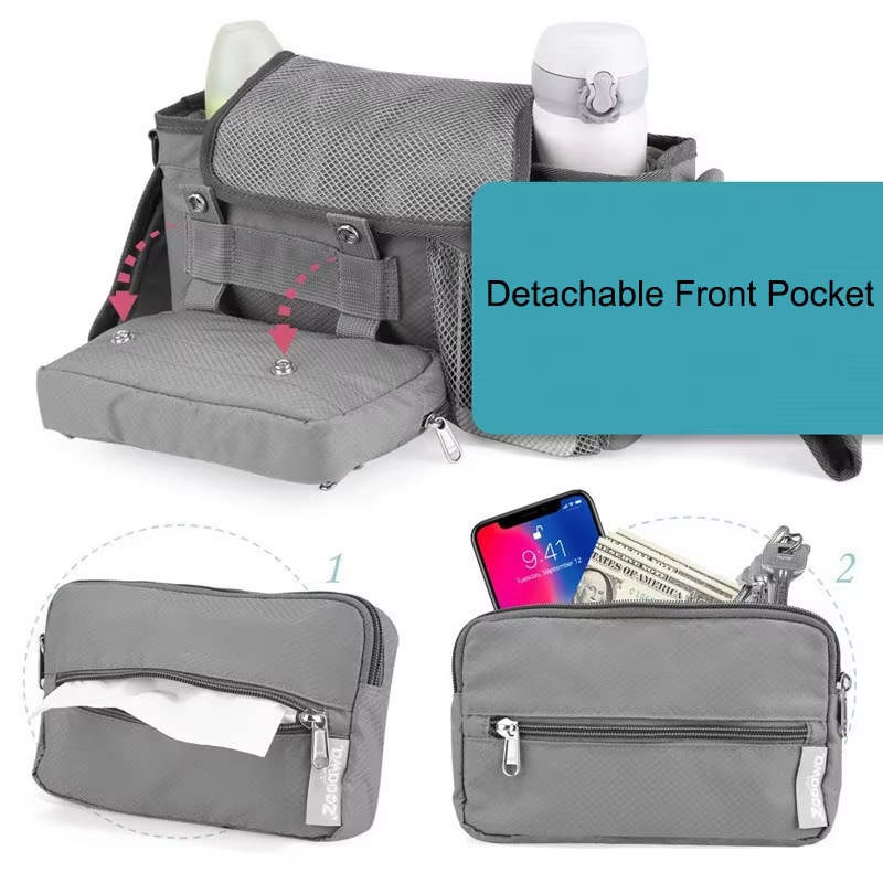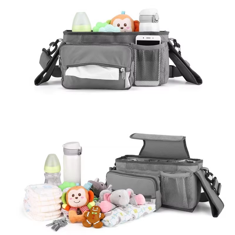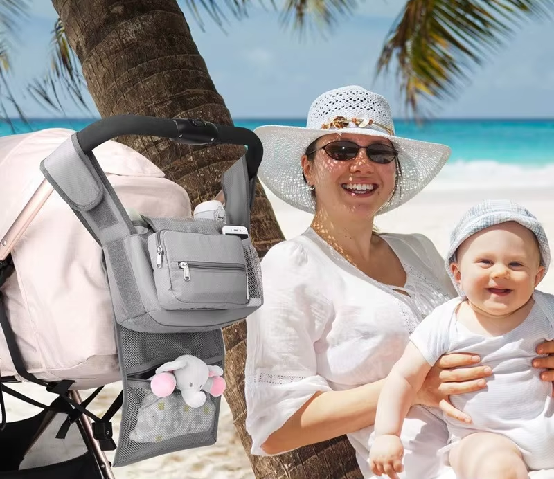 Organizador multifuncional con diseño de logotipo personalizado para cochecito de bebé, bolsa colgante con portabotellas, almacenamiento, cambio de pañales