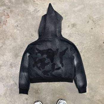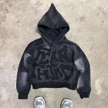 Sudadera con Capucha Corta y Holgada para Hombre, con Logotipo Personalizado Bordado, 100% Algodón, Estilo Hip Hop, Streetwear, con Pedrería y Parches Desgastados