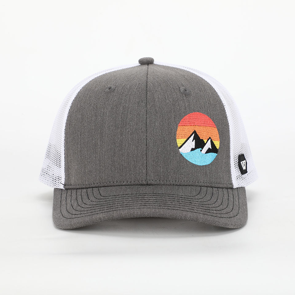 Gorra Trucker Unisex de Moda con Logotipo Personalizado Bordado, Malla Trasera, 6 Paneles, Cierre a Presión, con Parche de Montaña para Eventos Deportivos al Aire Libre