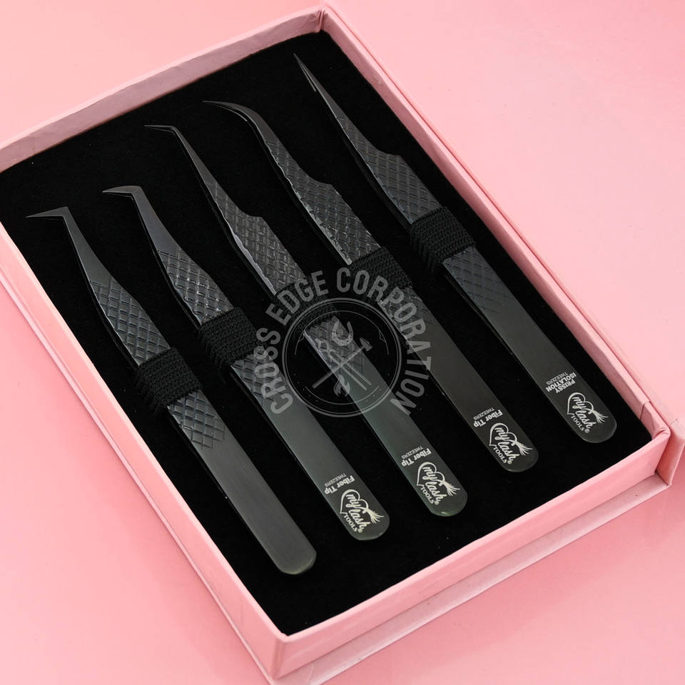 Pinzas para Extensión de Pestañas con Logotipo Personalizado, Punta de Fibra Curva Clásica, Punta Fina en X, Agarre de Diamante 45 Boot Volume, Antideslizantes