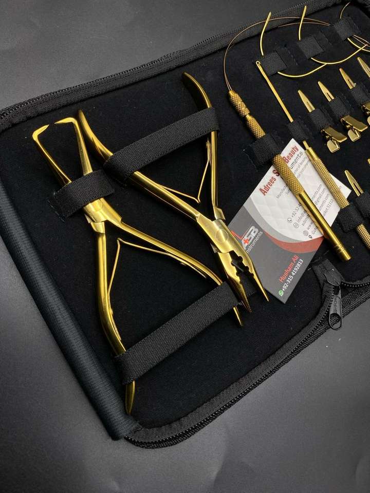 Kit de herramientas de extensión de cabello chapado en oro con logotipo personalizado, alicates de aguja de coser de acero inoxidable, pinzas y tijeras para cabello humano