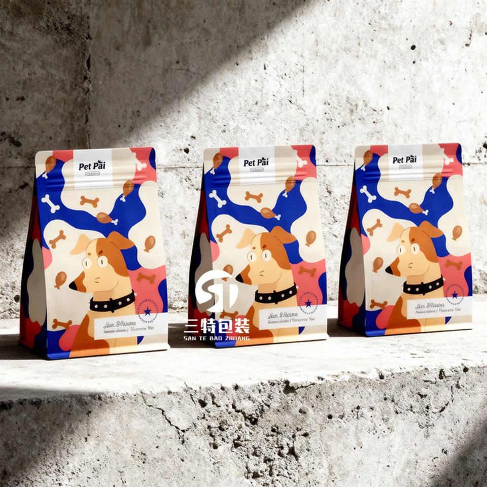 Bolsa de pie de PE con fondo cuadrado y sellado de ocho lados, impresa con logotipo personalizado, ecológica, de grado alimenticio, para alimentos enlatados y comida para perros.