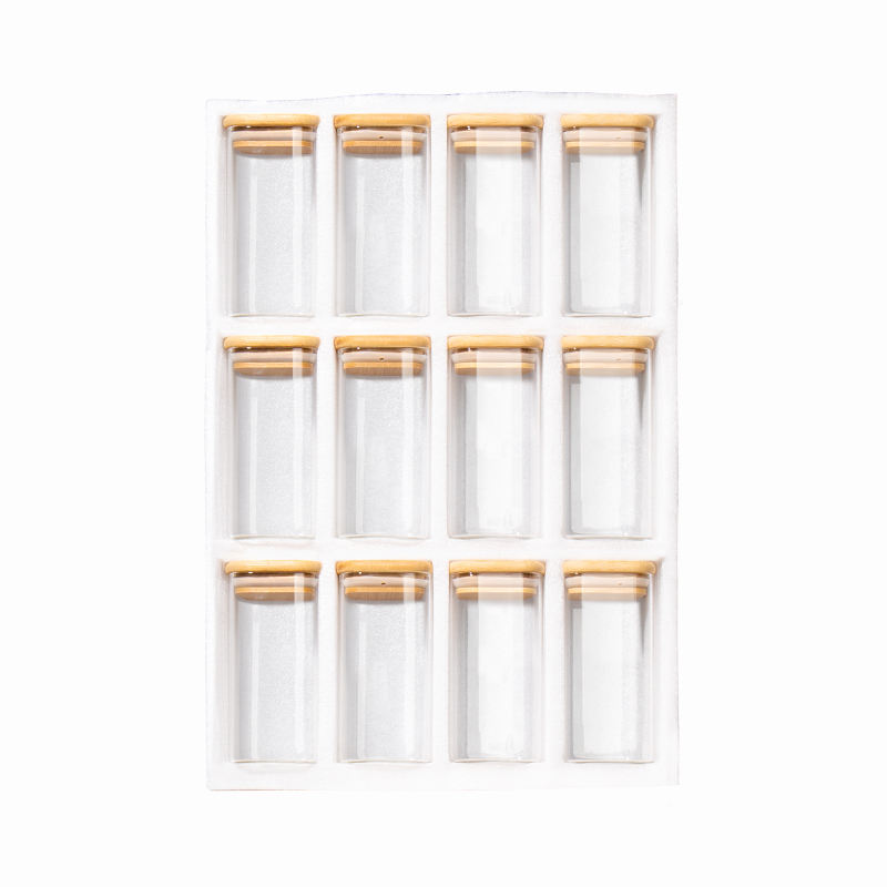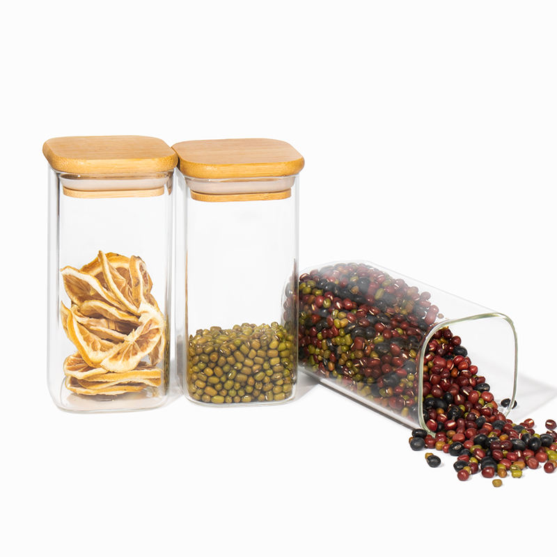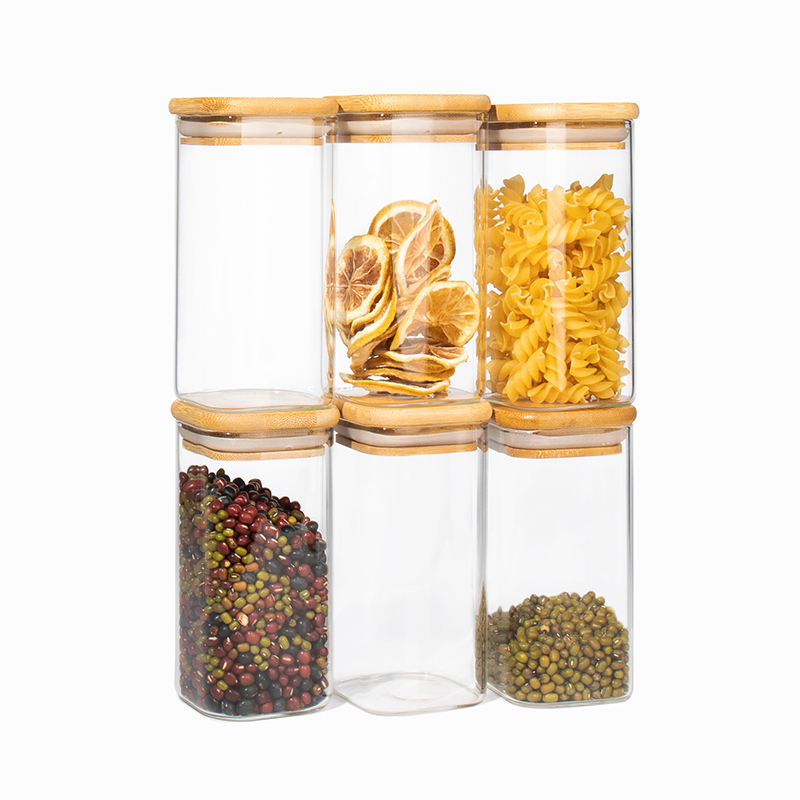 Botes de vidrio de cocina de borosilicato alto con logotipo personalizado, tarros de vidrio para almacenamiento de alimentos con tapas de madera de bambú para juego de contenedores Fugar