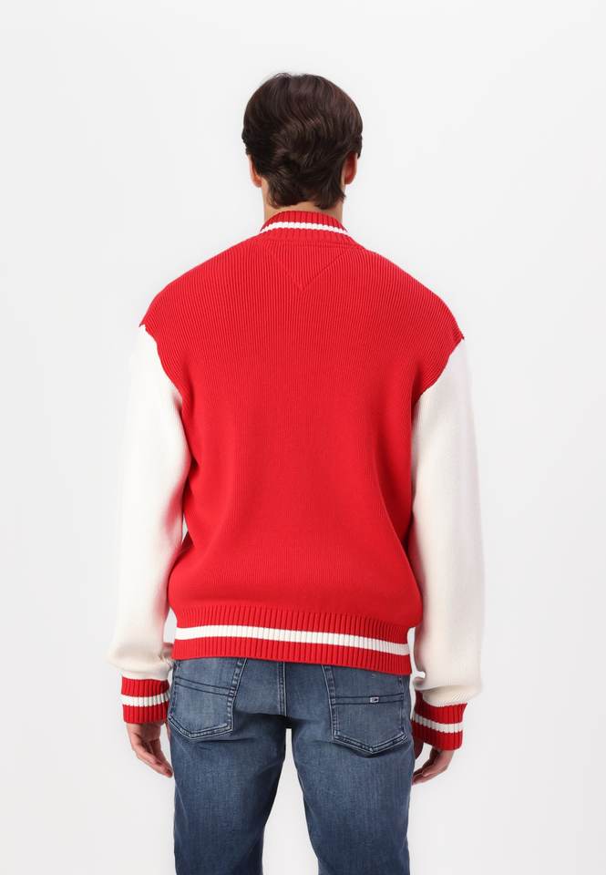 Chaqueta universitaria roja y blanca de alta calidad con logotipo personalizado para hombre, bombardero de béisbol con letras universitarias, puños acanalados con cuello de plumón