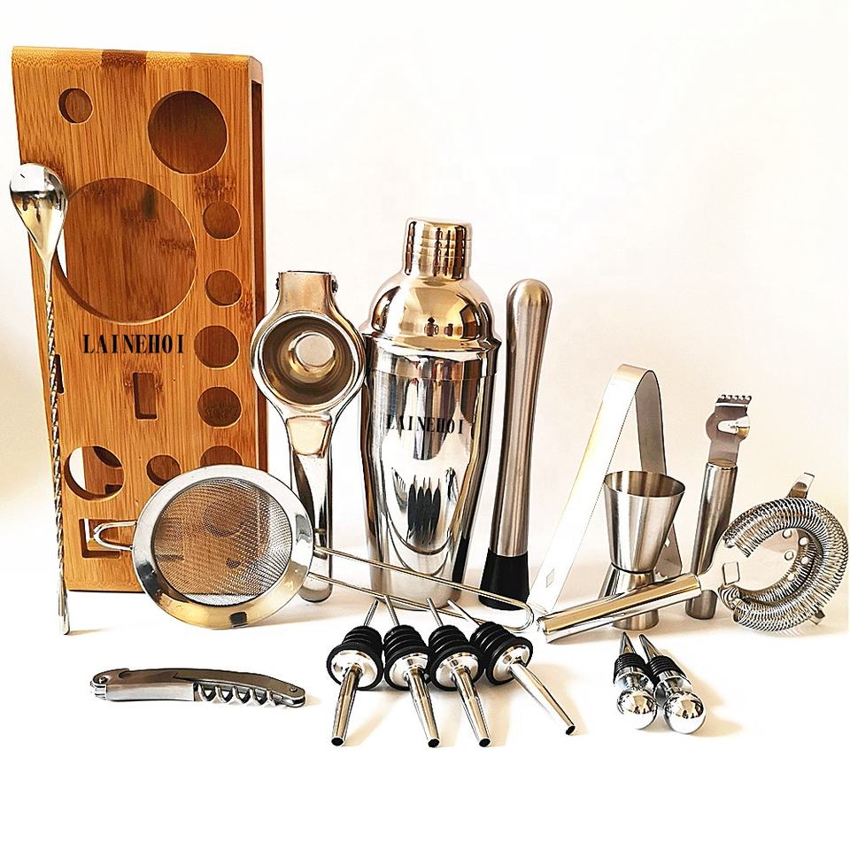 Juego de 17 piezas de herramientas de Bar con logotipo personalizado, soporte de bambú pendiente de patente, kit de camarero, coctelera