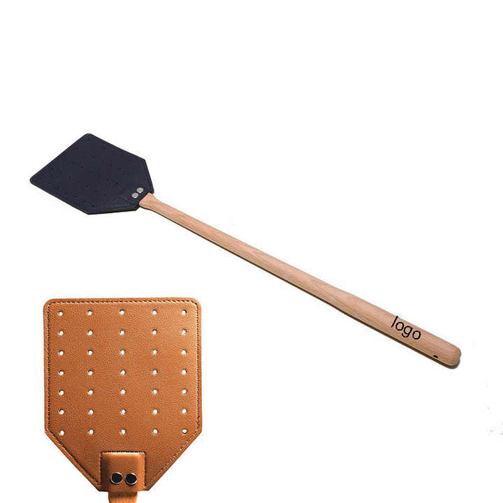 Matamoscas de cuero con logotipo personalizado, matamoscas doméstico de mango largo de madera de haya, matamoscas portátiles para exteriores