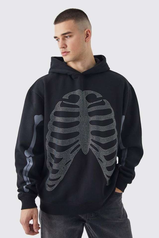 Sudadera unisex de manga larga con logotipo personalizado y estampado de esqueleto de peso pesado con cuerdas ostentosas Sudadera con capucha deportiva pulóver sudadera con diamantes de imitación