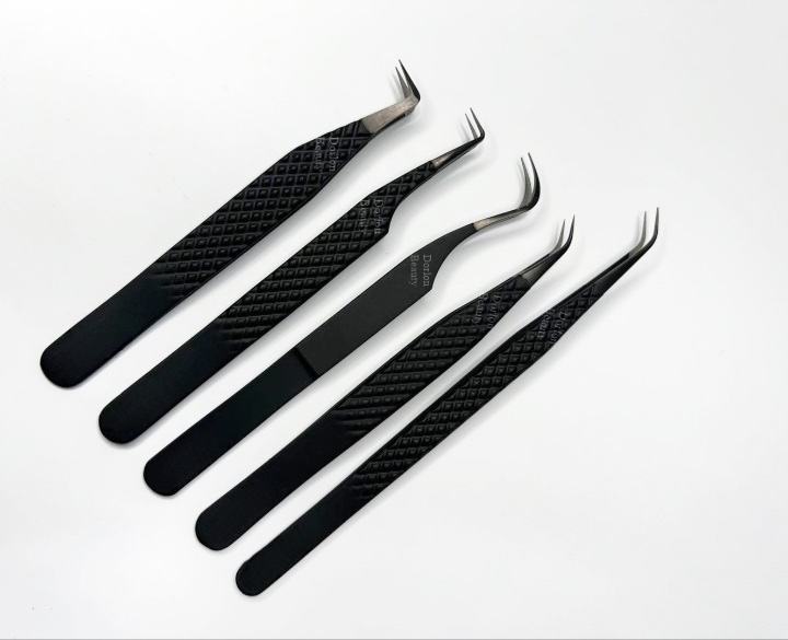 Juego de pinzas para pestañas de volumen curvo negro mate con logotipo personalizado, pinzas para pestañas con punta de fibra de volumen ruso de 90 grados para extensión de pestañas