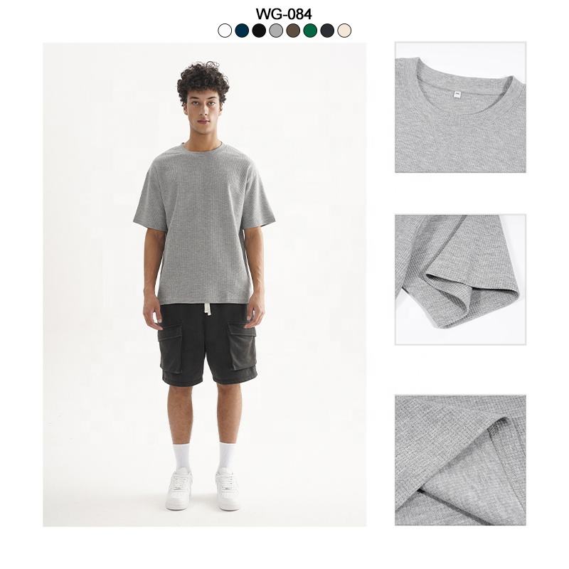 Camiseta de punto de gofres con cuello para hombre con logotipo personalizado, Camiseta de algodón transpirable de gran tamaño con hombros caídos, manga corta, patrón estampado de Color sólido