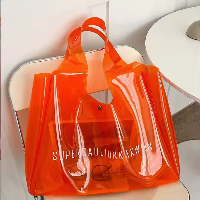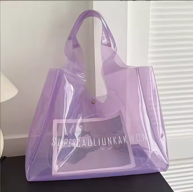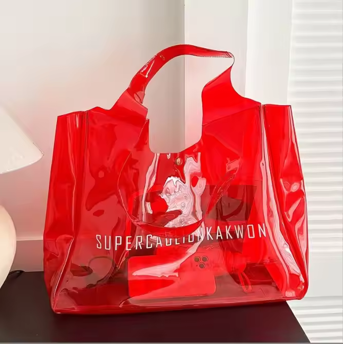 Bolso de mano grande de PVC con logotipo personalizado, bolso de compras, bolso de hombro transparente para playa y vacaciones
