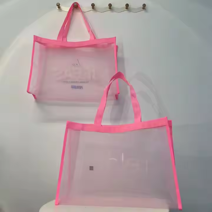 Bolsa de compras de malla de nailon con logotipo personalizado rosa para frutas y verduras