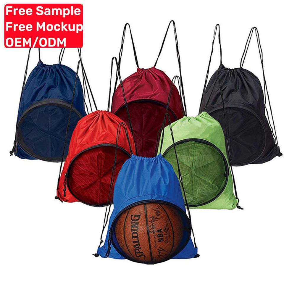 Mochila con cordón de poliéster con logotipo personalizado y compartimento para bolas, saco deportivo duradero para baloncesto, fútbol, voleibol, gimnasio