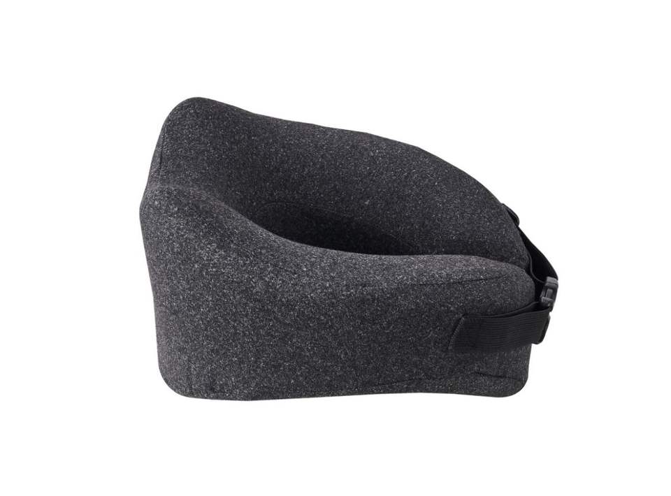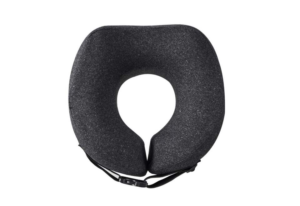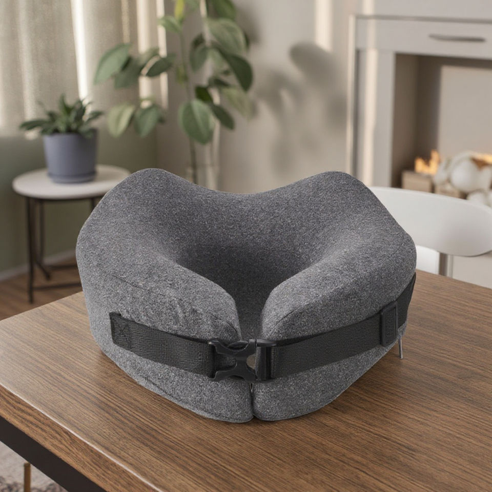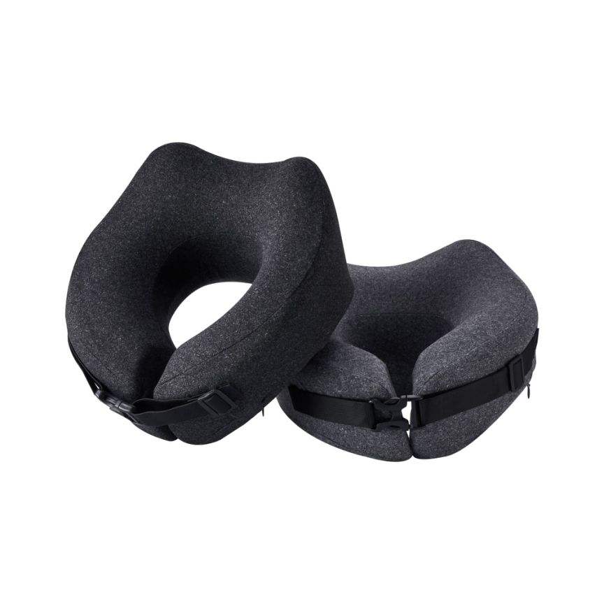 Almohada de viaje de espuma viscoelástica ajustable, ergonómica, portátil, con logotipo personalizado, con correa negra, soporte para el cuello en forma de U