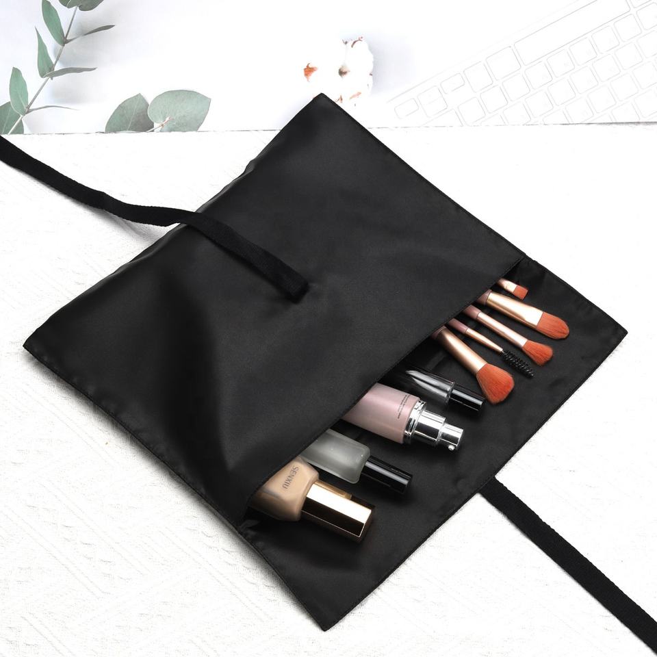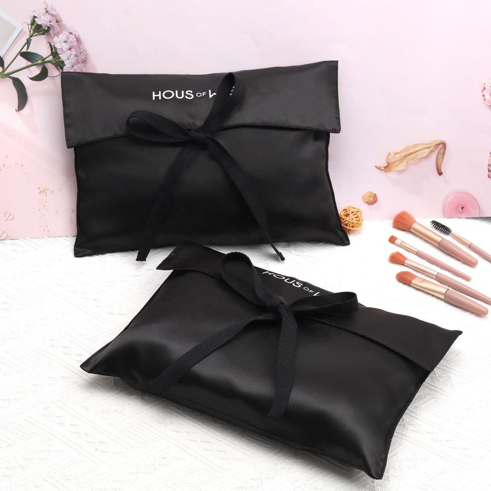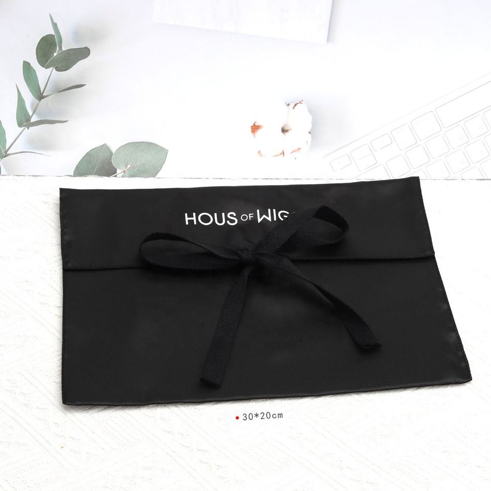 Sobre de embalaje de ropa de lencería con logotipo personalizado impreso, bolsa de satén con lazo, peluca de pelo de lujo negra, bolsa de seda con solapa antipolvo