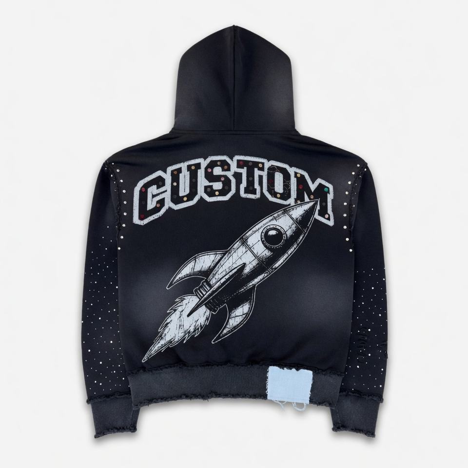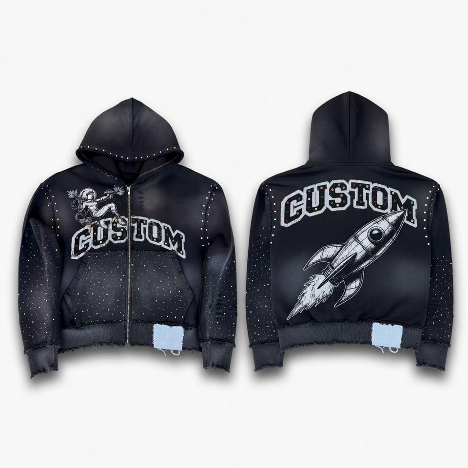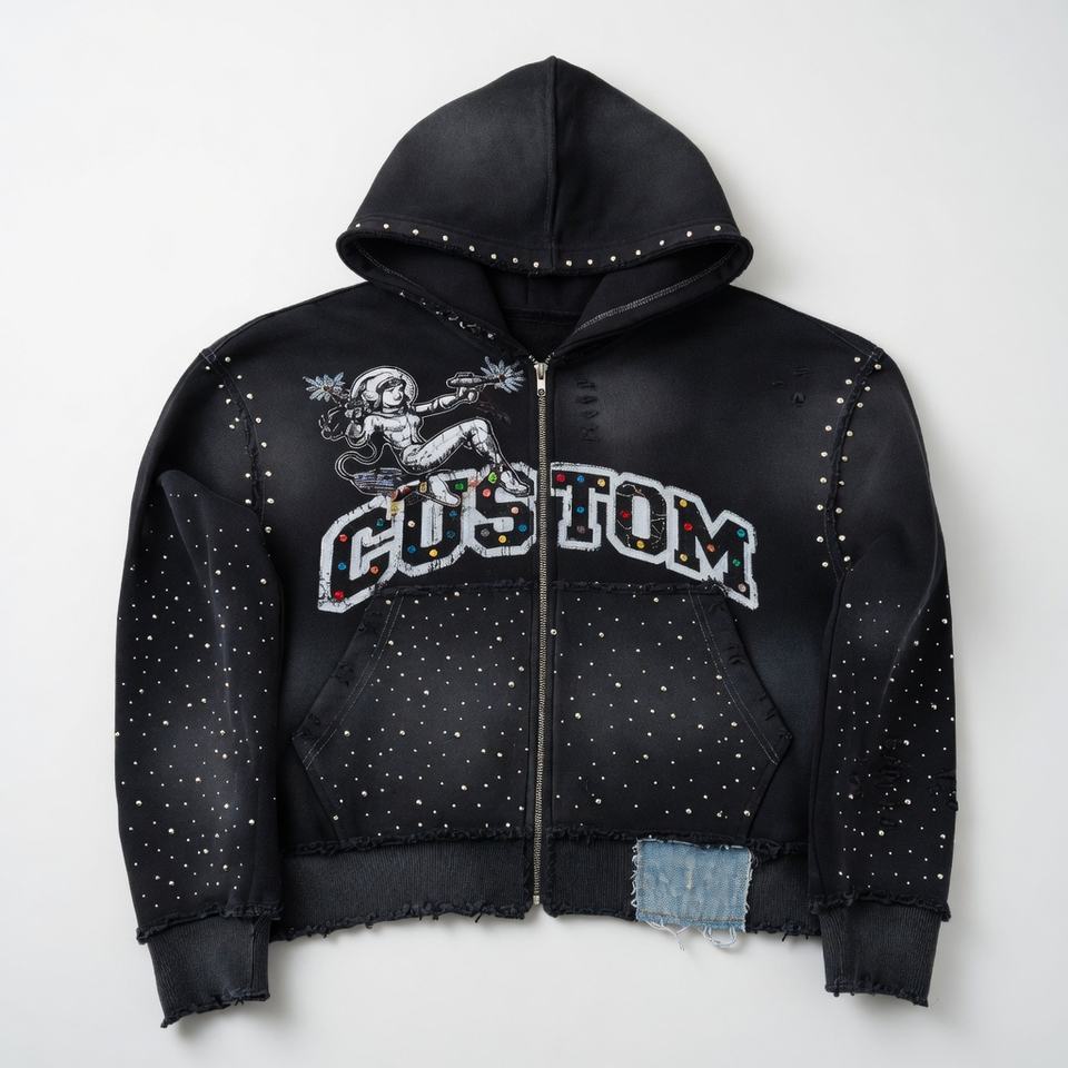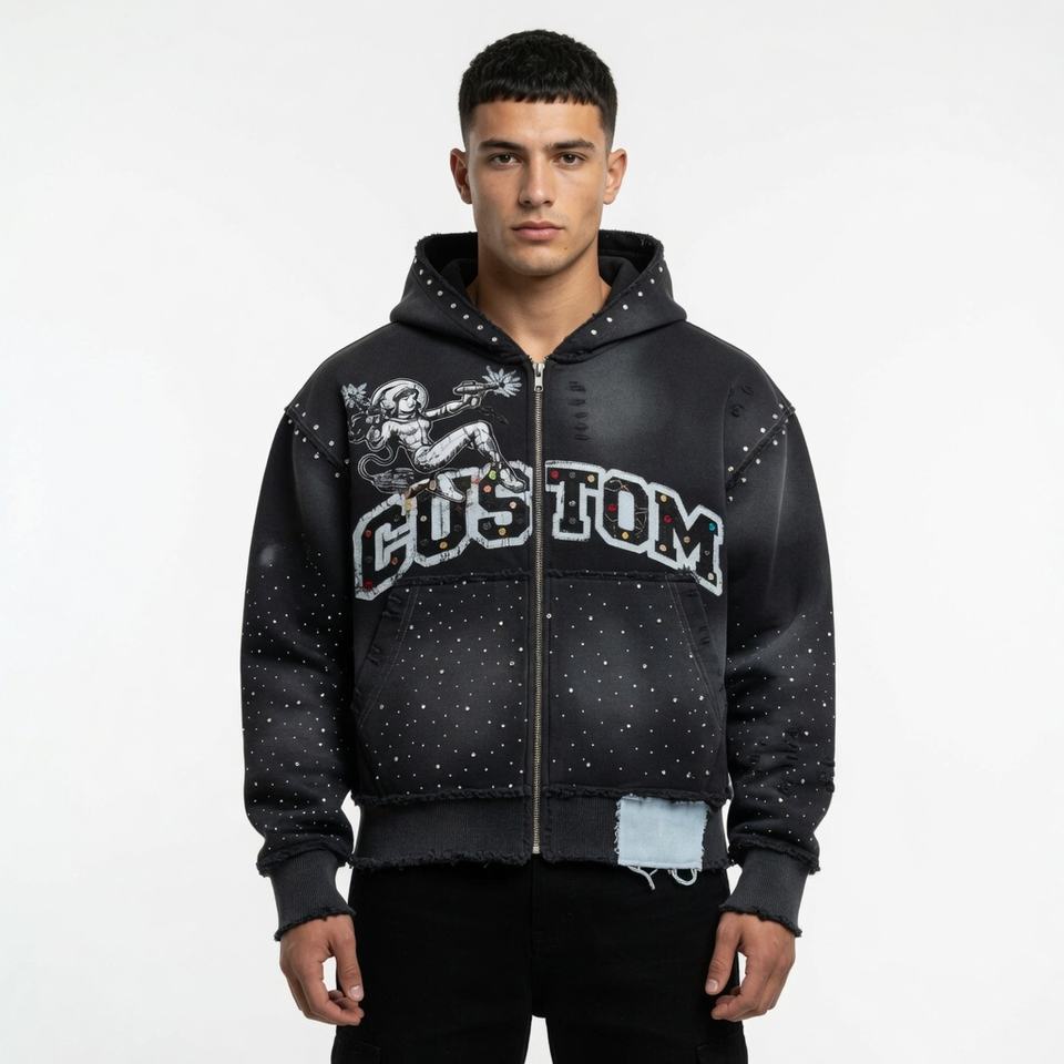 Sudadera con capucha extragrande con cremallera, efecto desgastado, con logo personalizado impreso, de alta calidad, 400 GSM, con efecto descolorido por el sol y pedrería, unisex.