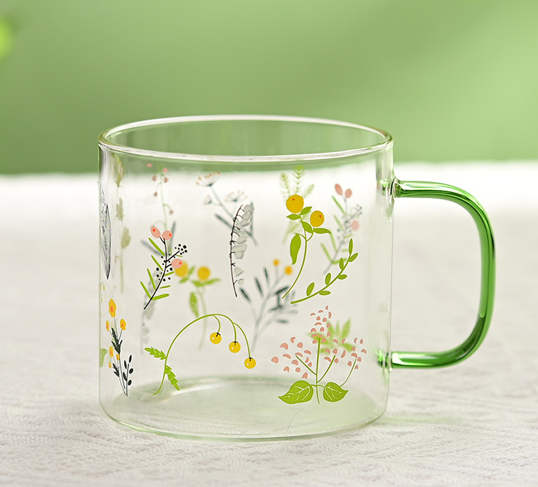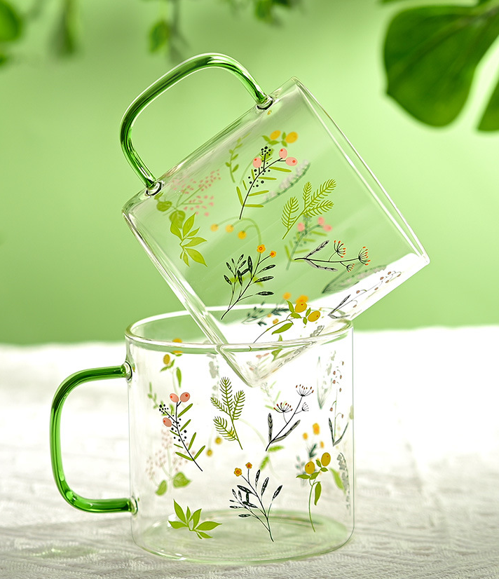 Impresión de logotipo personalizado de borosilicato alto regalo niña pequeña vajilla beber té taza de cristal mango resistente al calor taza de café de cristal