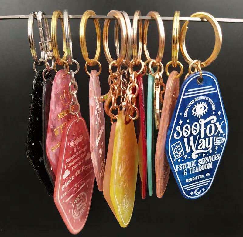 Custom Logo Printing Plastic Motel Keychain Glitter Hotel Acrylic Key Chains