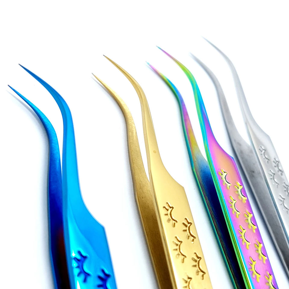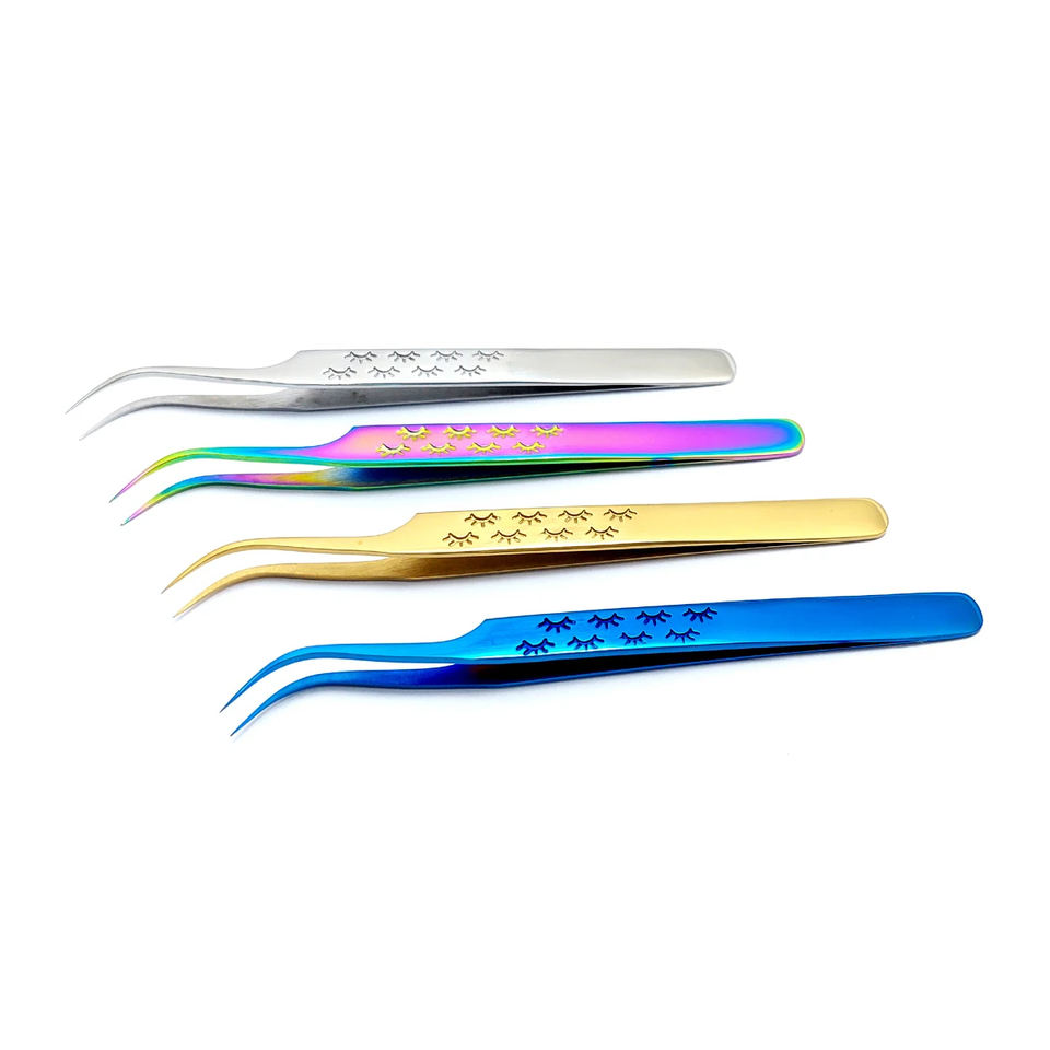 Pinzas de Acero Inoxidable Profesionales y Cómodas con Logotipo Personalizado, Ángulo de 45 Grados, Color Dorado, Azul y Multicolor, para Extensiones de Pestañas de Volumen