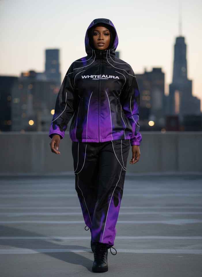 Conjunto de Chaqueta y Pantalones Deportivos Ligeros de Nailon Morado con Logotipo Personalizado, Chaqueta con Capucha Impermeable y Pantalones, Conjunto de 2 Piezas