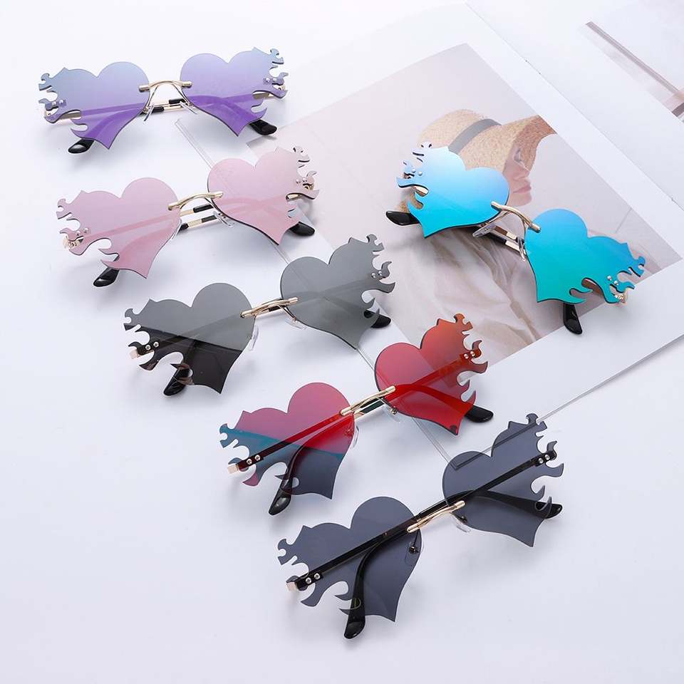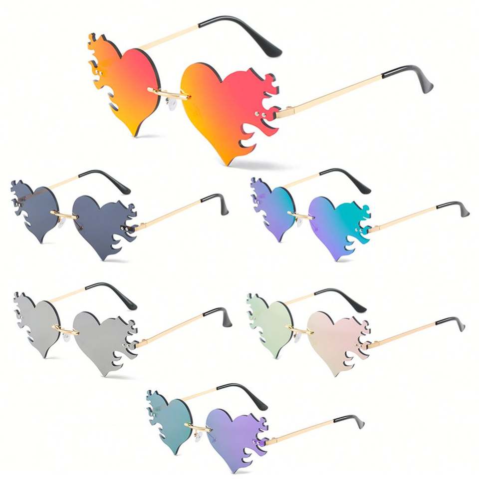 Gafas de Sol Retro con Logotipo Personalizado, Montura sin Aro, Lentes de Espejo Transparentes con Forma de Corazón de Llama, Protección UV400, Gafas de Sol para Mujer con Forma de Corazón de Llama