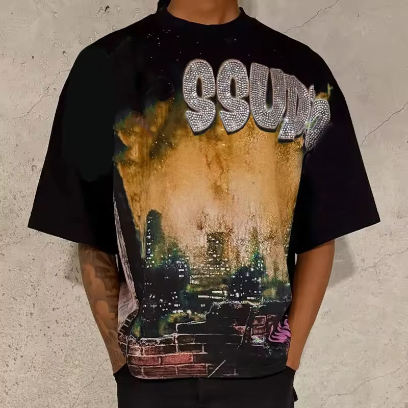 Camiseta de Hombre Personalizada con Logotipo de Diamantes de Imitación, Estilo Urbano, Lavado Ácido, Vintage, Gráfico, de Algodón 100% Pesado