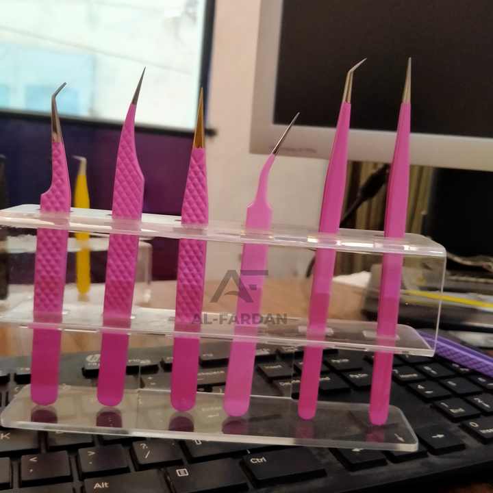 Pinzas de extensión de pestañas de ángulo delgado de 14 cm con logotipo personalizado rosa brillante, soporte de exhibición acrílico de acero inoxidable puntiagudo para