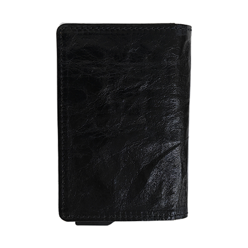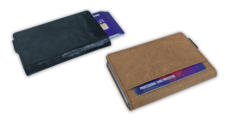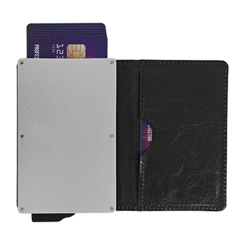 Tarjetero delgado con logotipo personalizado, cartera emergente de cuero con bloqueo RFID, tarjetero de aluminio y metal