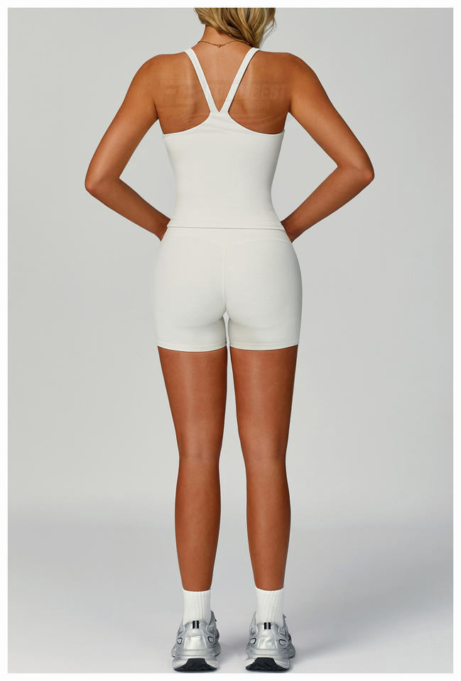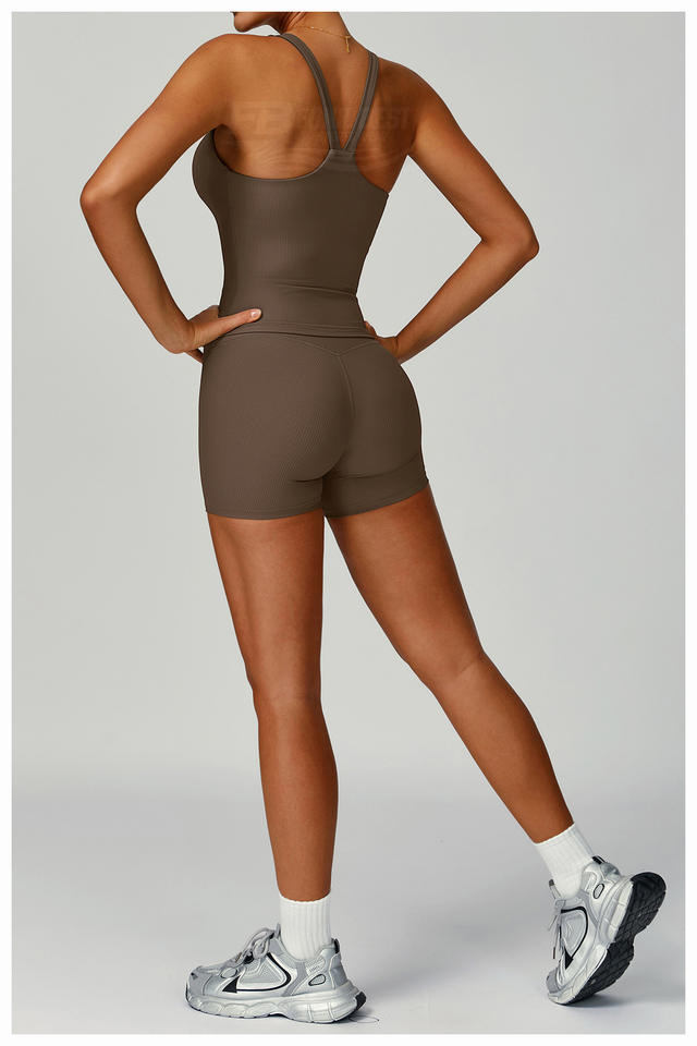 Conjunto de Yoga de Dos Piezas para Mujer con Logotipo Personalizado, Top Acanalado Sólido, Pantalones Cortos de Cintura Alta, Ajustados, Antiarrugas, para Correr y Hacer Ejercicio