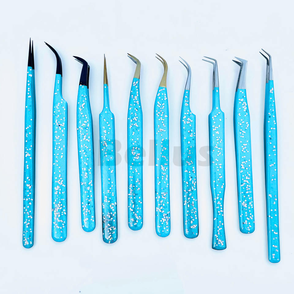 Pinzas de pestañas azules brillantes con logotipo personalizado, puntas de volumen y aislamiento, herramienta de pestañas de acero inoxidable para extensiones, suministro al por mayor
