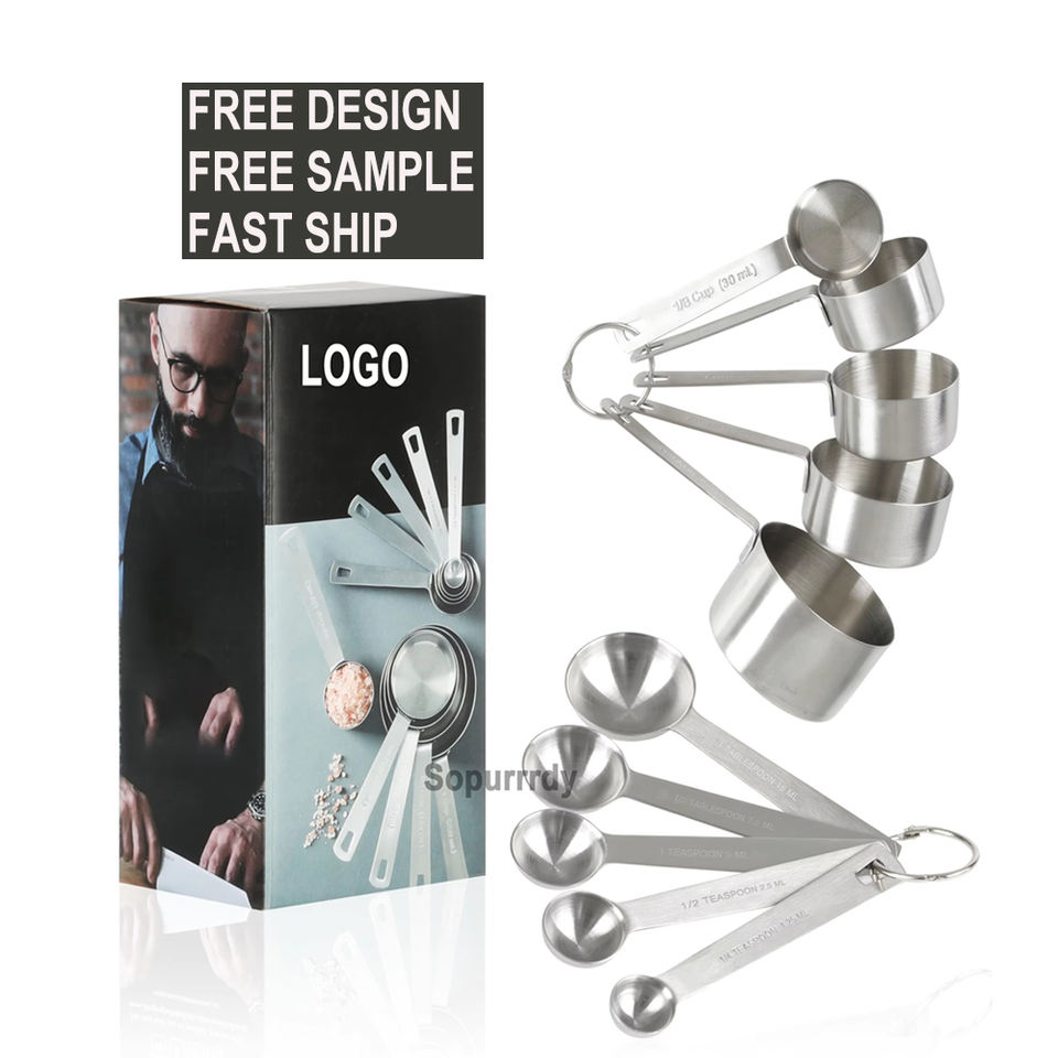 Juego de tazas y cucharas medidoras de acero inoxidable con logotipo personalizado Juego de tazas y cucharas medidoras apilables de primera calidad Juego de vajilla