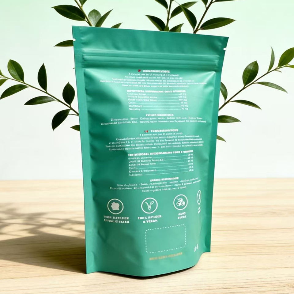 Bolsa de empaque de alimentos con logotipo personalizado, tipo stand-up pouch, para proteínas, bebidas herbales en polvo, con cierre de cremallera.
