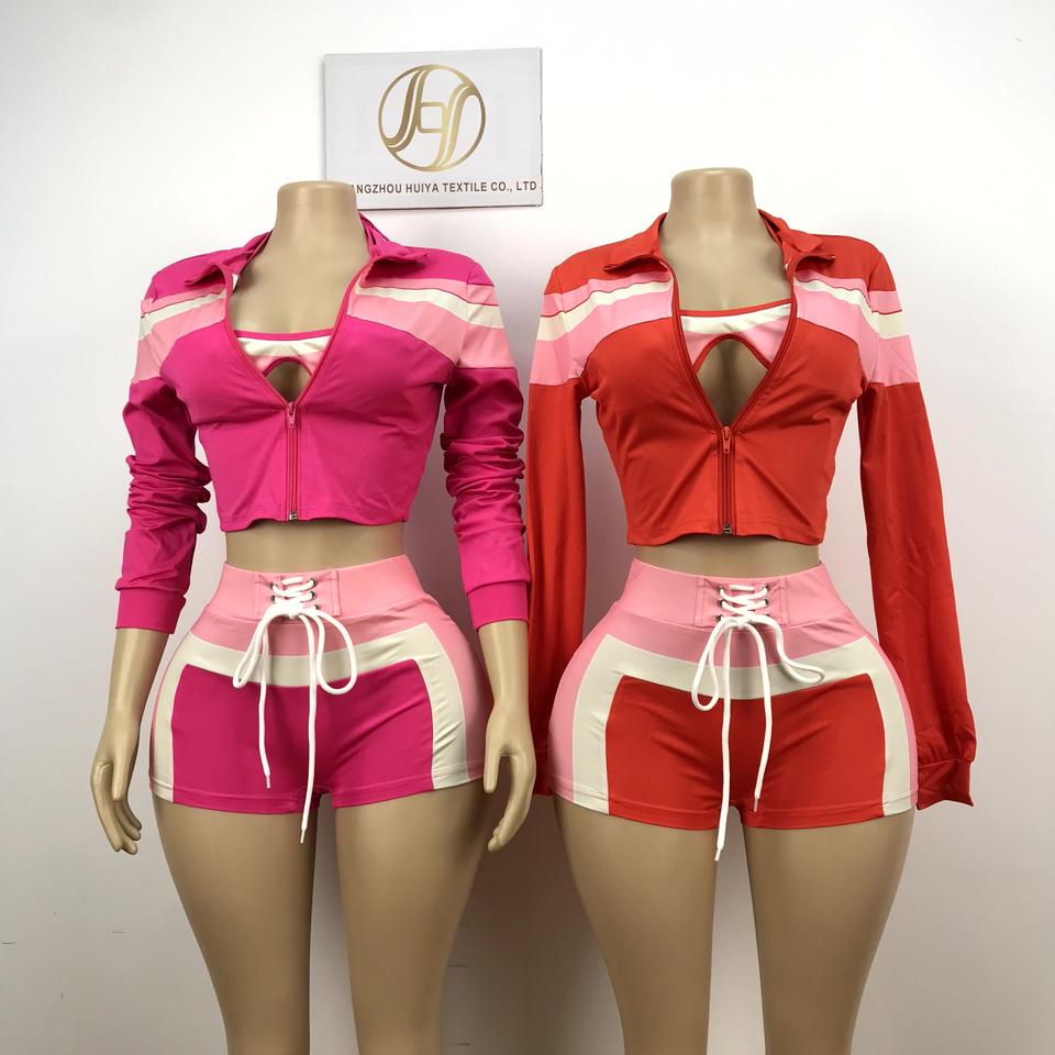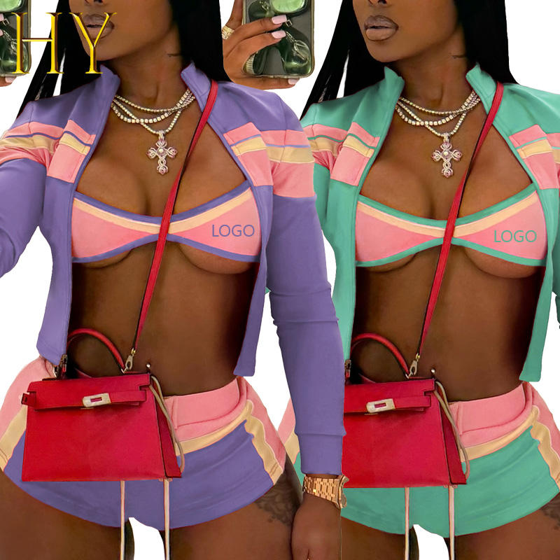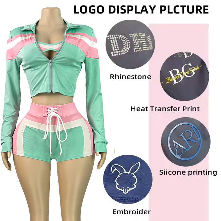 Conjuntos de Shorts de Color Contrastante con Logotipo Personalizado, Ropa Urbana para Mujer 2025, Chaqueta Corta con Cremallera, Top Corto y Shorts, Conjuntos de 3 Piezas para Mujer