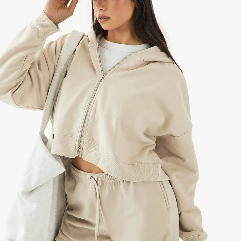 Conjunto Deportivo de Verano para Mujer, Sudadera con Capucha Corta y Holgada de Felpa, Pantalones Cortos, 2 Piezas, Poliéster/Algodón, Transpirable, con Logotipo Personalizado