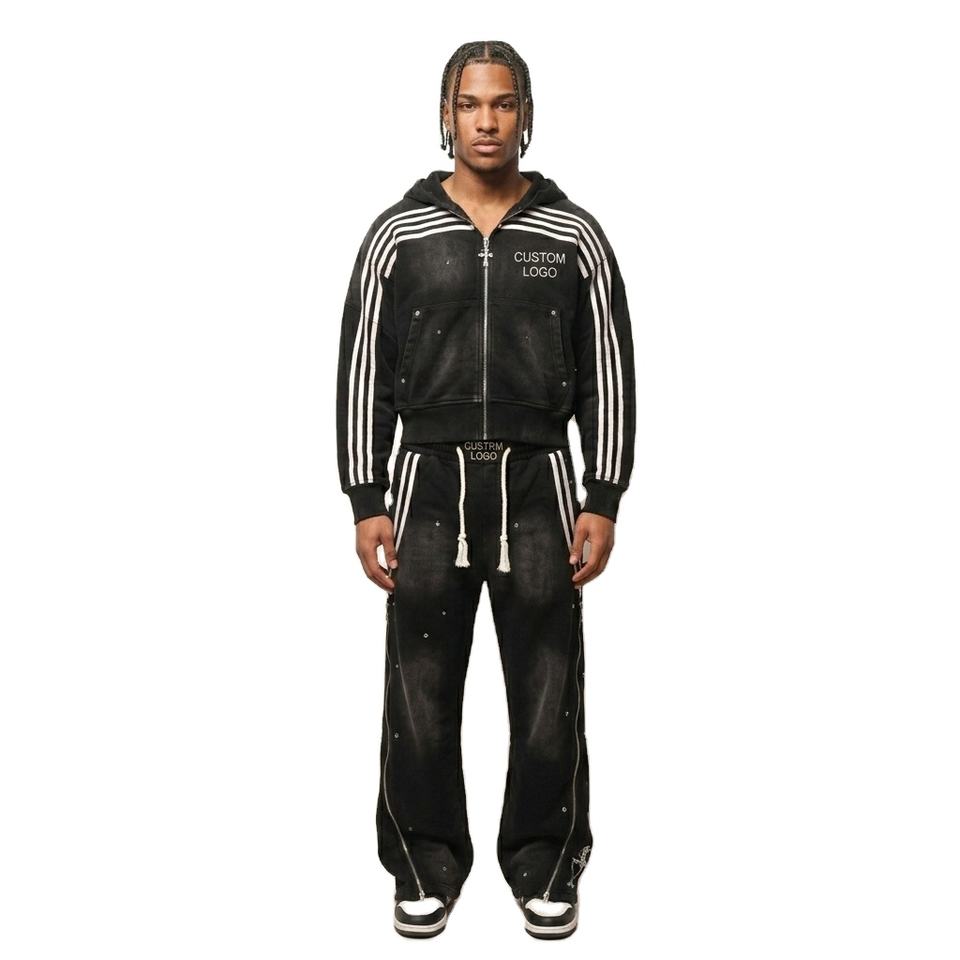 Conjunto de Sudadera con Capucha Corta y Pantalones Deportivos con Logotipo Personalizado, Efecto Desgastado por el Sol, Estilo Vintage con Rayas, Unisex para Hombre y Mujer