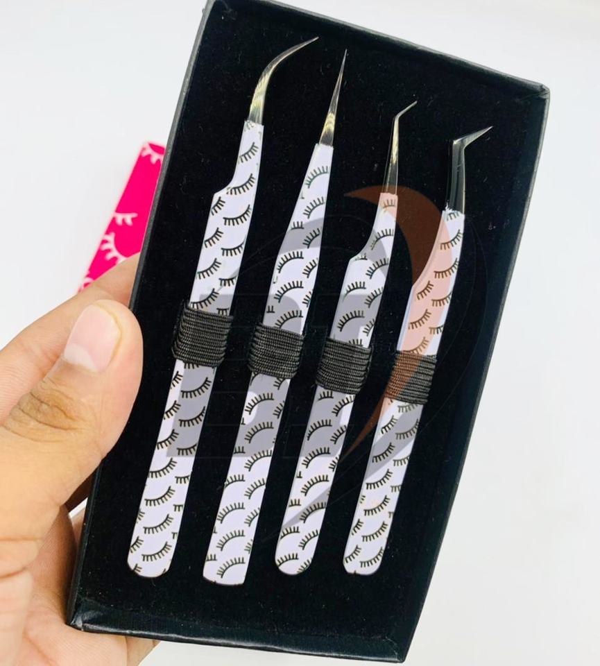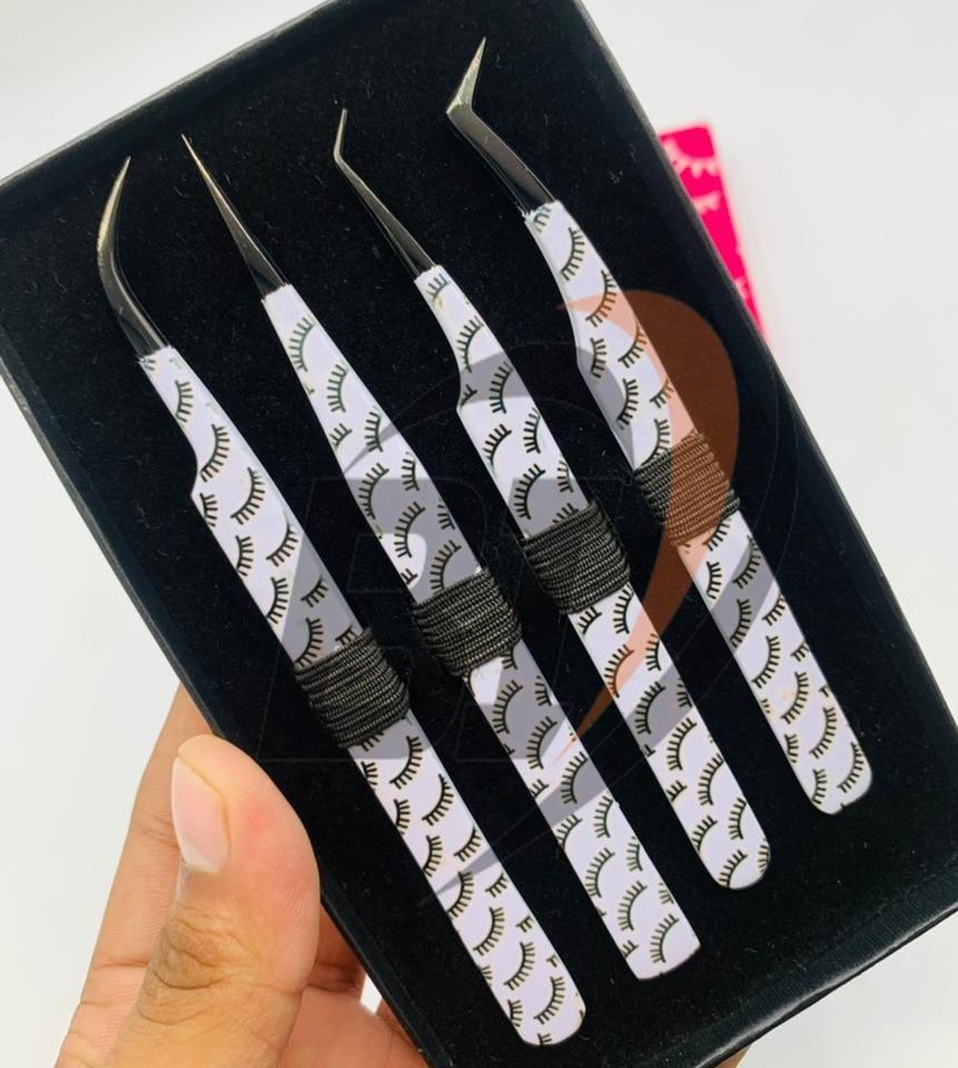 Pinzas de extensión de pestañas de acero inoxidable sostenibles con logotipo personalizado, curvas recubiertas de papel/volumen ruso/impresión de pestañas de 45 grados