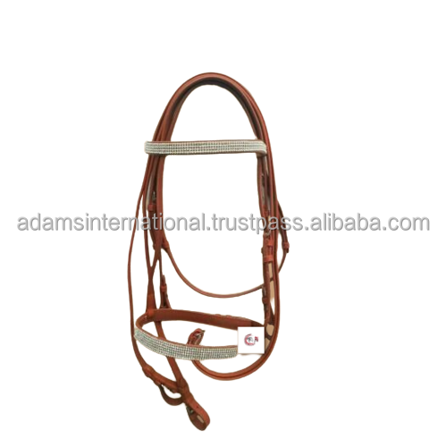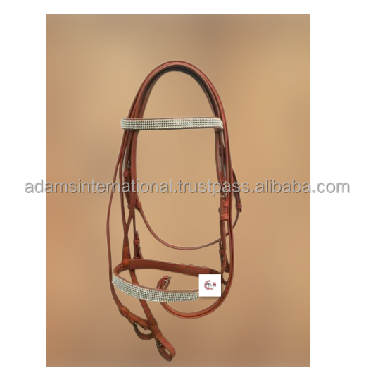 Brida de cazador de cuero tostado con logotipo personalizado para montar a caballo 4 filas de cristales blancos en la banda para la frente