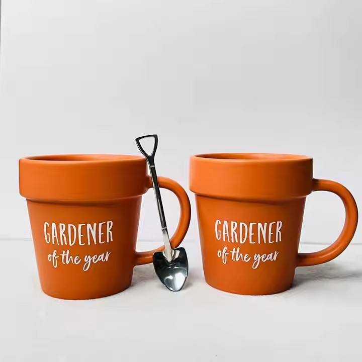 Custom Logo Terracotta Flower Pot Coffee Mug Cute Ceramic Plant Pot Mug with Shovel Spoon