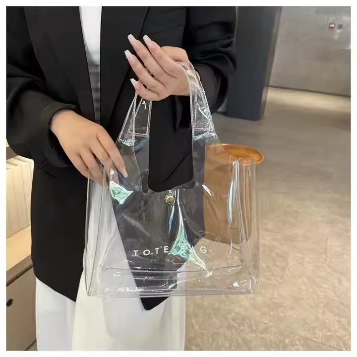 Bolsa de Compras de PVC Grueso con Logotipo Personalizado, Diseño Holográfico Láser Iridiscente, con Asa Elegante, Moderna y Chic