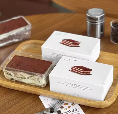 Caja de pastel de papel de arte transparente con logotipo personalizado brillante/Latte Matt laminación en relieve postre para galletas aperitivos contenedor de tiramisú