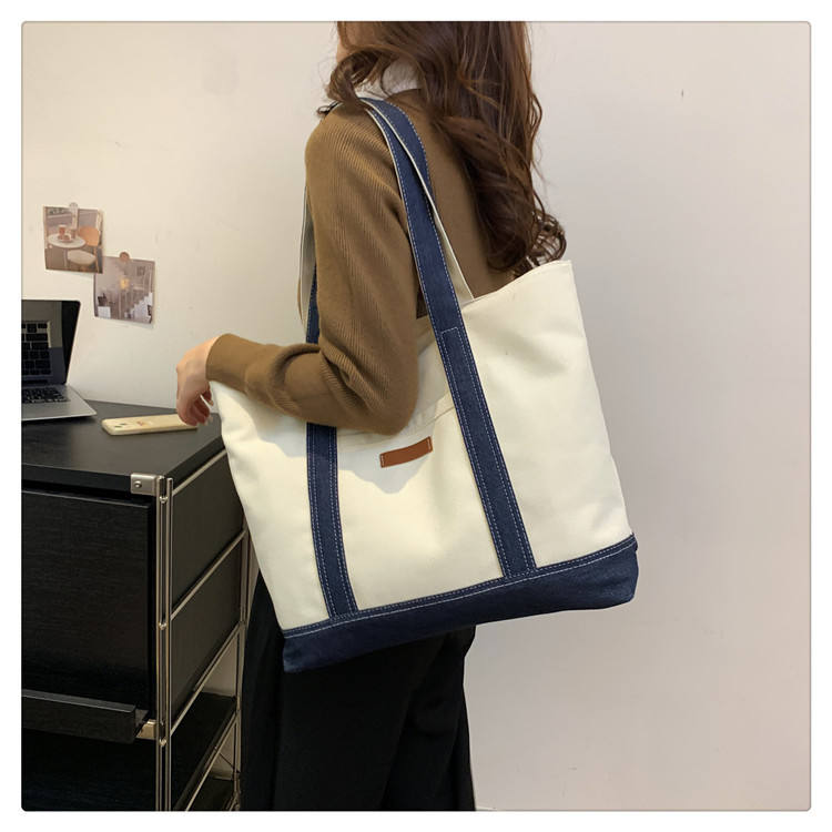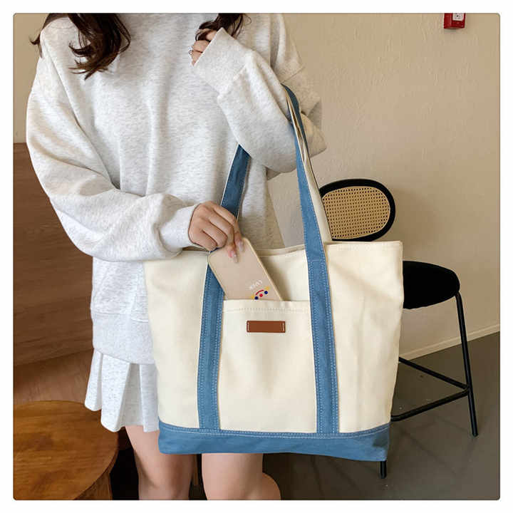 Bolsa de Mano de Lona de Dos Tonos con Logotipo Personalizado, Bolso de Algodón con Bloques de Color, con Cierre y Múltiples Bolsillos para Mujer, para Viajes, Aire Libre, Uso Diario y Fin de Semana