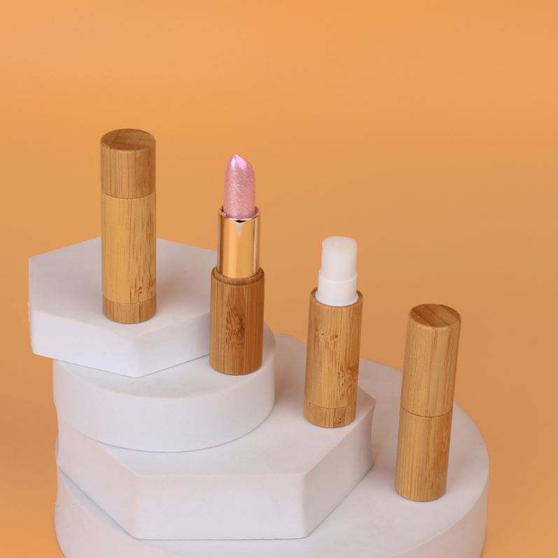 Bálsamo Labial Vegano con Logotipo Personalizado, Brillo Único, Efecto Voluminizador, Color Rosa Cambiante, con Destellos Finos, en Tubos de Madera, Hidratante