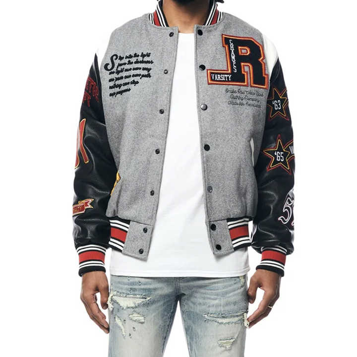 Chaqueta universitaria con logotipo personalizado para hombre, chaqueta universitaria de béisbol con mangas de cuero, chaqueta bordada con letras de piloto para hombre